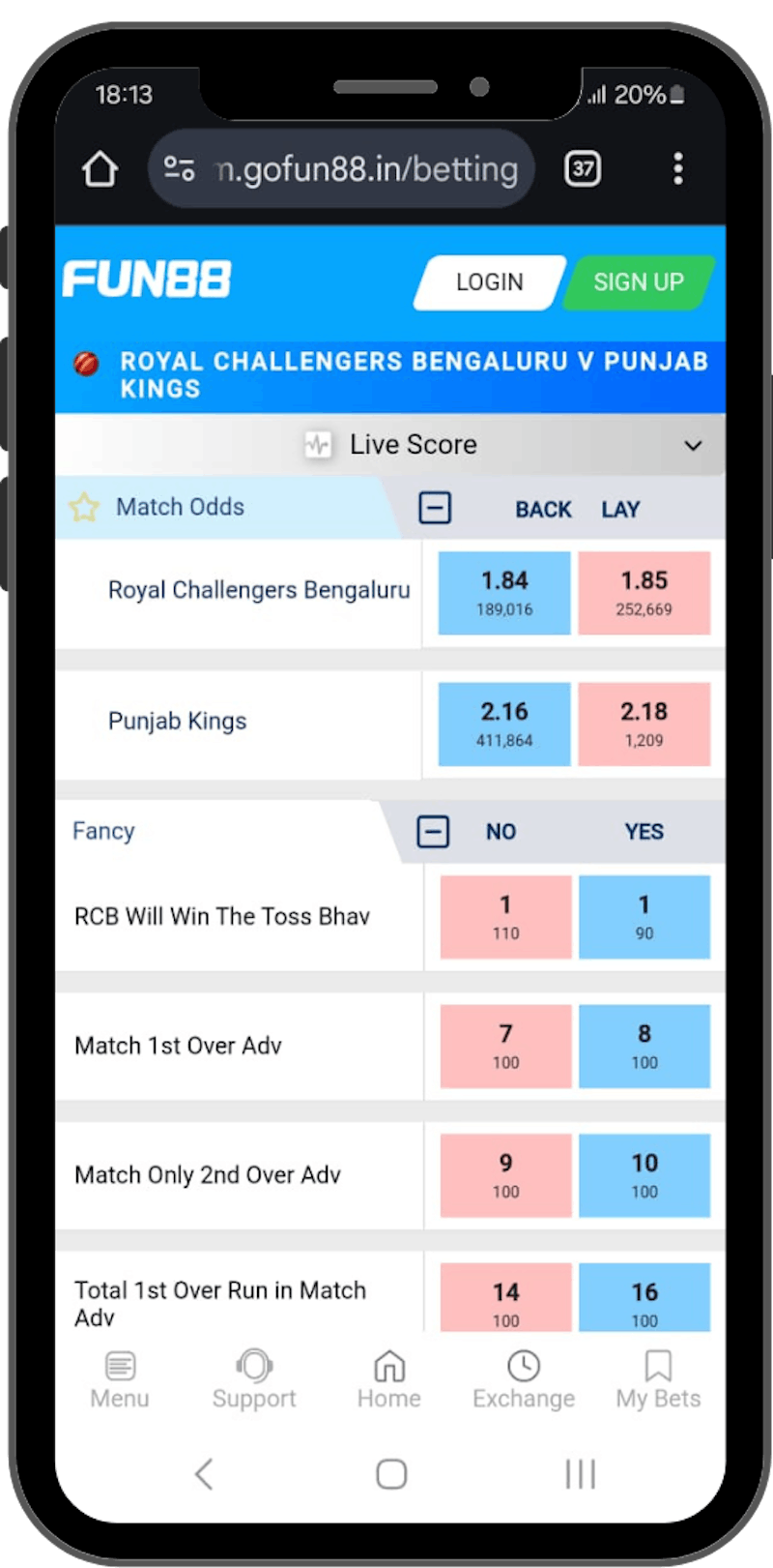 Fun88 takes things to the next level with its betting exchange, offering a fantastic variety of markets across popular Indian sports.