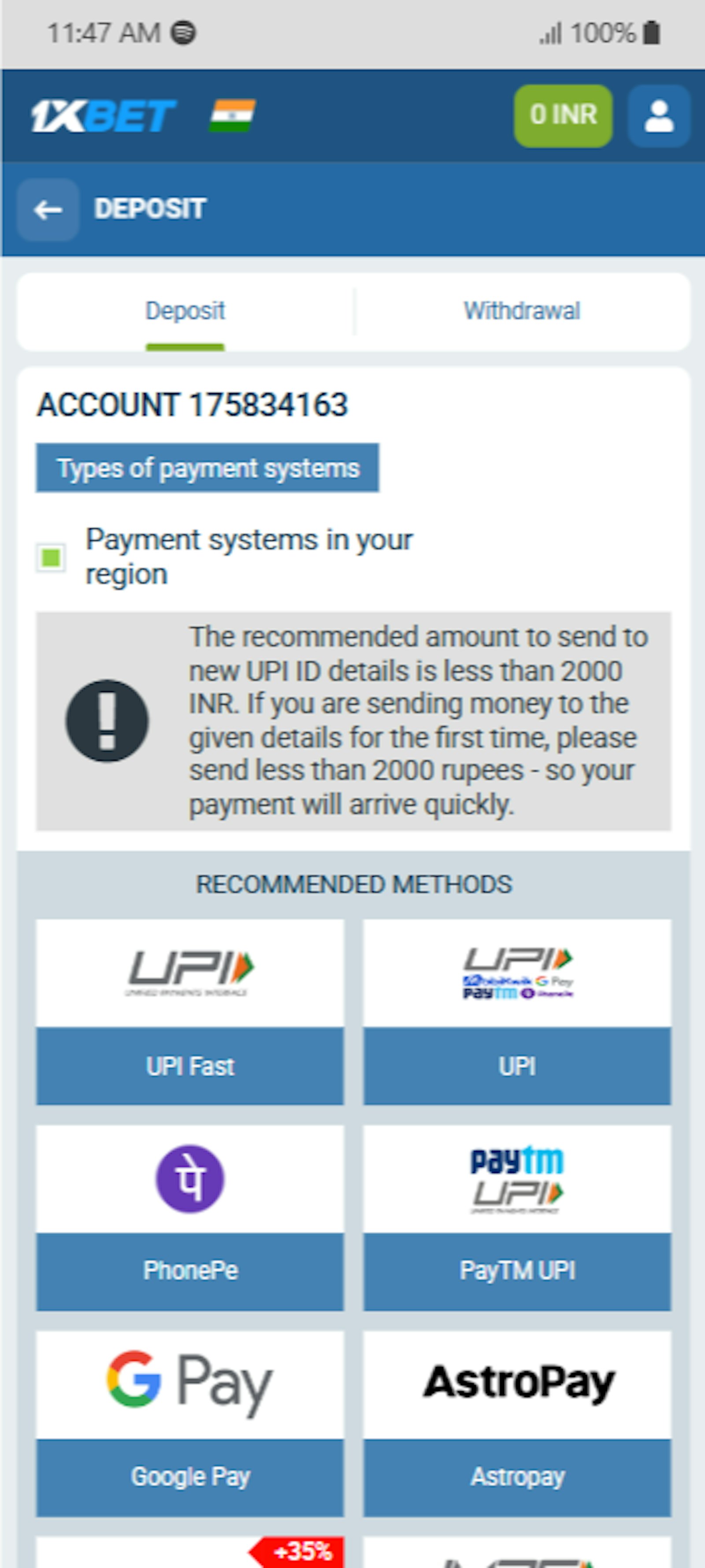 The minimum deposit can be anything, ranging from 200 INR to 1000 INR. However, in our experience, it's usually 500 INR with Google Pay and UPI.