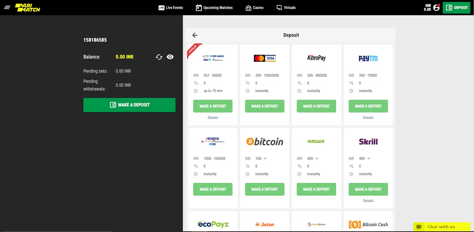 While Parimatch accepts many great deposit methods such as Paytm and Indian Netbanking, the best way to deposit is using UPI.